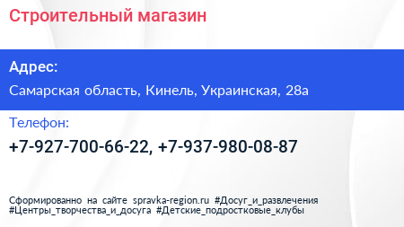 Строительный магазин по адресу Самарская область, Кинель, Украинская, 28а в дальнейшем Организация, размещена в следующих категориях: