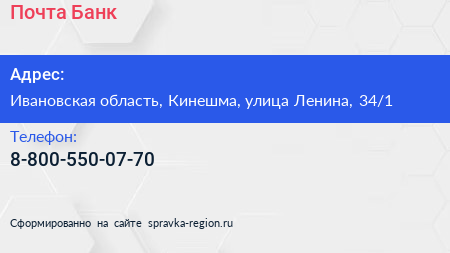 Почта Банк по адресу Ивановская область, Кинешма, улица Ленина, 34/1 в дальнейшем Организация, размещена в следующих категориях: