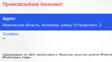 Промсвязьбанк, банкомат по адресу Ивановская область, Кинешма, улица Островского, 2 в дальнейшем Организация, размещена в следующих категориях: