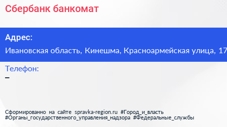 Сбербанк, банкомат по адресу Ивановская область, Кинешма, Красноармейская улица, 17 в дальнейшем Организация, размещена в следующих категориях: