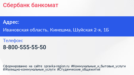 Сбербанк, банкомат по адресу Ивановская область, Кинешма, Шуйская 2-я, 1Б в дальнейшем Организация, размещена в следующих категориях: