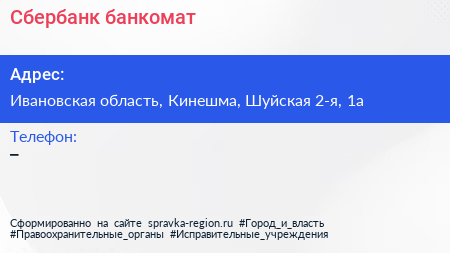 Сбербанк, банкомат по адресу Ивановская область, Кинешма, Шуйская 2-я, 1а в дальнейшем Организация, размещена в следующих категориях: