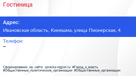 Гостиница по адресу Ивановская область, Кинешма, улица Пионерская, 4 в дальнейшем Организация, размещена в следующих категориях: