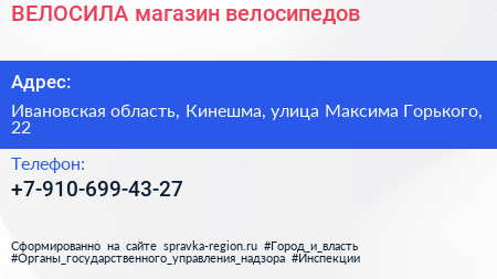 ВЕЛОСИЛА, магазин велосипедов по адресу Ивановская область, Кинешма, улица Максима Горького, 22 в дальнейшем Организация, размещена в следующих категориях:
