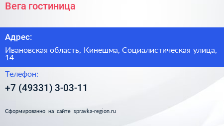 Вега, гостиница по адресу Ивановская область, Кинешма, Социалистическая улица, 14 в дальнейшем Организация, размещена в следующих категориях: