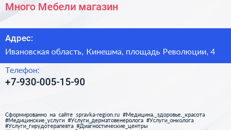 Много Мебели, магазин по адресу Ивановская область, Кинешма, площадь Революции, 4 в дальнейшем Организация, размещена в следующих категориях: