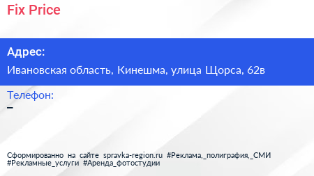 Fix Price по адресу Ивановская область, Кинешма, улица Щорса, 62в в дальнейшем Организация, размещена в следующих категориях: