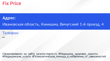 Fix Price по адресу Ивановская область, Кинешма, Вичугский 1-й проезд, 4 в дальнейшем Организация, размещена в следующих категориях: