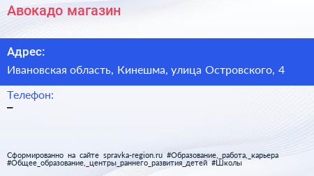 Авокадо, магазин по адресу Ивановская область, Кинешма, улица Островского, 4 в дальнейшем Организация, размещена в следующих категориях:
