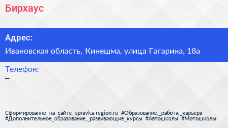 Бирхаус по адресу Ивановская область, Кинешма, улица Гагарина, 18а в дальнейшем Организация, размещена в следующих категориях: