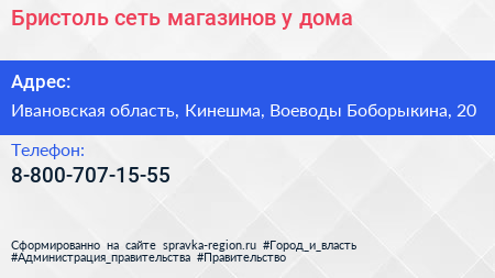 Бристоль, сеть магазинов у дома по адресу Ивановская область, Кинешма, Воеводы Боборыкина, 20 в дальнейшем Организация, размещена в следующих категориях: