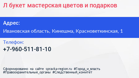 Л-букет, мастерская цветов и подарков по адресу Ивановская область, Кинешма, Красноветкинская, 1 в дальнейшем Организация, размещена в следующих категориях:
