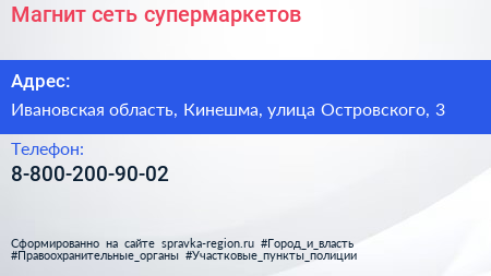 Магнит, сеть супермаркетов по адресу Ивановская область, Кинешма, улица Островского, 3 в дальнейшем Организация, размещена в следующих категориях: