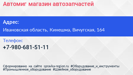 Автомиг, магазин автозапчастей по адресу Ивановская область, Кинешма, Вичугская, 164 в дальнейшем Организация, размещена в следующих категориях: