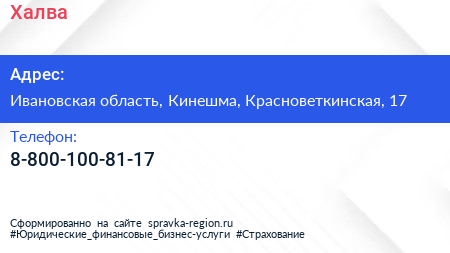 Халва по адресу Ивановская область, Кинешма, Красноветкинская, 17 в дальнейшем Организация, размещена в следующих категориях: