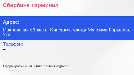 Сбербанк, терминал по адресу Ивановская область, Кинешма, улица Максима Горького, 9/2 в дальнейшем Организация, размещена в следующих категориях: