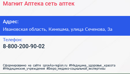 Магнит Аптека, сеть аптек по адресу Ивановская область, Кинешма, улица Сеченова, 3а в дальнейшем Организация, размещена в следующих категориях: