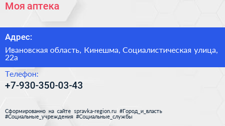 Моя аптека по адресу Ивановская область, Кинешма, Социалистическая улица, 22а в дальнейшем Организация, размещена в следующих категориях: