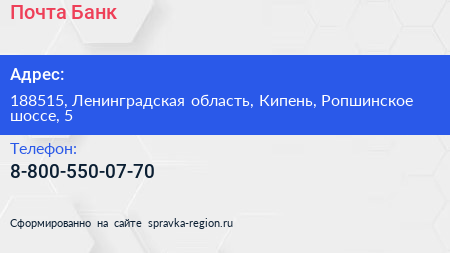 Почта Банк по адресу 188515, Ленинградская область, Кипень, Ропшинское шоссе, 5 в дальнейшем Организация, размещена в следующих категориях: