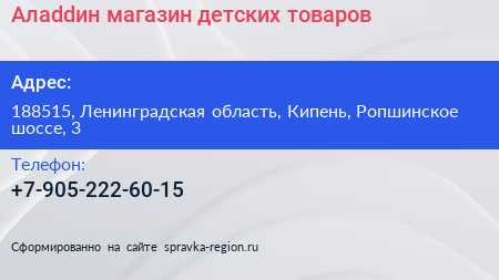 Алаddин, магазин детских товаров по адресу 188515, Ленинградская область, Кипень, Ропшинское шоссе, 3 в дальнейшем Организация, размещена в следующих категориях: