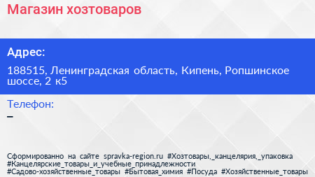 Магазин хозтоваров по адресу 188515, Ленинградская область, Кипень, Ропшинское шоссе, 2 к5 в дальнейшем Организация, размещена в следующих категориях: