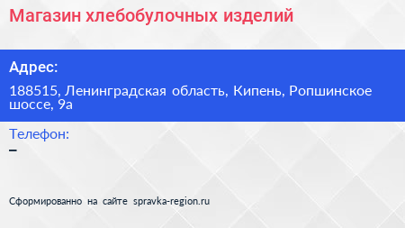 Магазин хлебобулочных изделий по адресу 188515, Ленинградская область, Кипень, Ропшинское шоссе, 9а в дальнейшем Организация, размещена в следующих категориях: