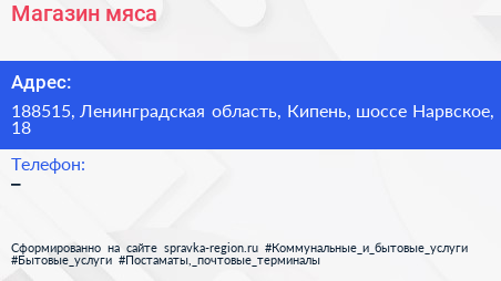 Магазин мяса по адресу 188515, Ленинградская область, Кипень, шоссе Нарвское, 18 в дальнейшем Организация, размещена в следующих категориях: