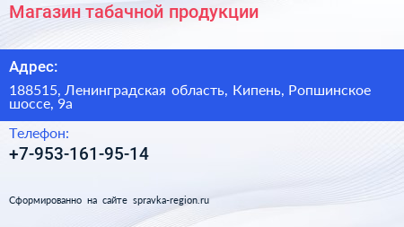 Магазин табачной продукции по адресу 188515, Ленинградская область, Кипень, Ропшинское шоссе, 9а в дальнейшем Организация, размещена в следующих категориях: