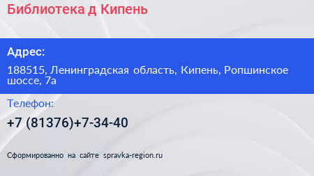 Библиотека, д. Кипень по адресу 188515, Ленинградская область, Кипень, Ропшинское шоссе, 7а в дальнейшем Организация, размещена в следующих категориях: