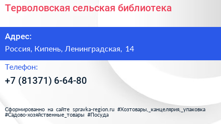Терволовская сельская библиотека по адресу Дом Культуры Терволово, Спортивная улица, Терволово, Гатчинский муниципальный округ, Ленинградская область, Северо-Западный федеральный округ, 188351, Россия в дальнейшем Организация, размещена в следующих категориях: