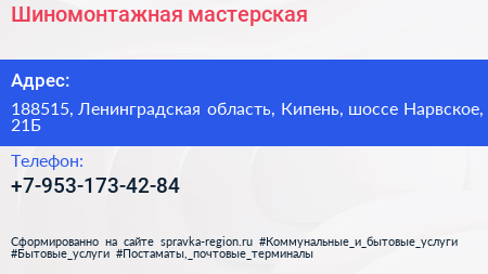 Шиномонтажная мастерская по адресу 188515, Ленинградская область, Кипень, шоссе Нарвское, 21Б в дальнейшем Организация, размещена в следующих категориях: