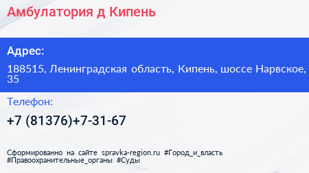 Амбулатория, д. Кипень по адресу 188515, Ленинградская область, Кипень, шоссе Нарвское, 35 в дальнейшем Организация, размещена в следующих категориях: