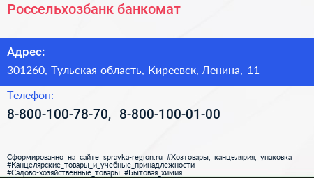 Россельхозбанк, банкомат по адресу 301260, Тульская область, Киреевск, Ленина, 11 в дальнейшем Организация, размещена в следующих категориях: