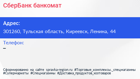 СберБанк, банкомат по адресу 301260, Тульская область, Киреевск, Ленина, 44 в дальнейшем Организация, размещена в следующих категориях: