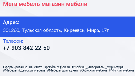 Мега мебель, магазин мебели по адресу 301260, Тульская область, Киреевск, Мира, 17г в дальнейшем Организация, размещена в следующих категориях:
