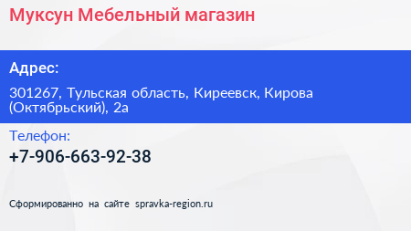Муксун, Мебельный магазин по адресу 301267, Тульская область, Киреевск, Кирова (Октябрьский), 2а в дальнейшем Организация, размещена в следующих категориях: