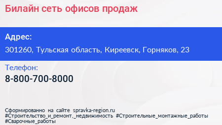 Билайн, сеть офисов продаж по адресу 301260, Тульская область, Киреевск, Горняков, 23 в дальнейшем Организация, размещена в следующих категориях: