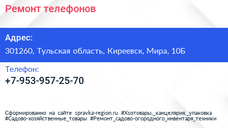 Ремонт телефонов по адресу 301260, Тульская область, Киреевск, Мира, 10Б в дальнейшем Организация, размещена в следующих категориях: