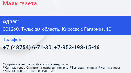 Маяк, газета по адресу 301260, Тульская область, Киреевск, Гагарина, 10 в дальнейшем Организация, размещена в следующих категориях: