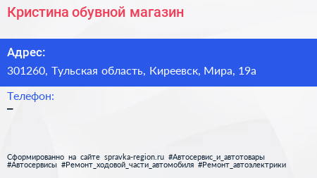 Кристина, обувной магазин по адресу 301260, Тульская область, Киреевск, Мира, 19а в дальнейшем Организация, размещена в следующих категориях: