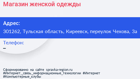 Магазин женской одежды по адресу 301262, Тульская область, Киреевск, переулок Чехова, 3а в дальнейшем Организация, размещена в следующих категориях: