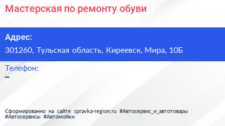 Мастерская по ремонту обуви по адресу 301260, Тульская область, Киреевск, Мира, 10Б в дальнейшем Организация, размещена в следующих категориях: