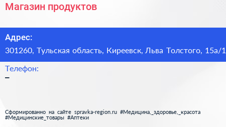 Магазин продуктов по адресу 301260, Тульская область, Киреевск, Льва Толстого, 15а/1 в дальнейшем Организация, размещена в следующих категориях: