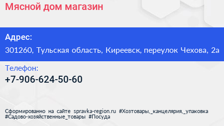 Мясной дом, магазин по адресу 301260, Тульская область, Киреевск, переулок Чехова, 2а в дальнейшем Организация, размещена в следующих категориях: