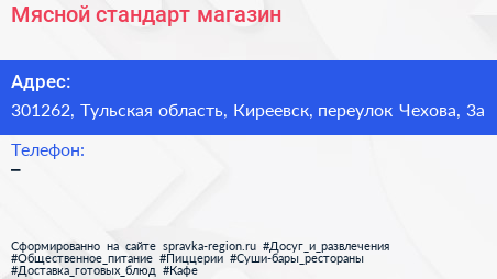 Мясной стандарт, магазин по адресу 301262, Тульская область, Киреевск, переулок Чехова, 3а в дальнейшем Организация, размещена в следующих категориях: