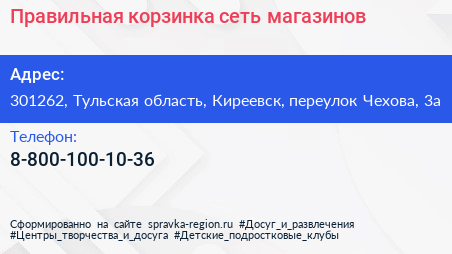 Правильная корзинка, сеть магазинов по адресу 301262, Тульская область, Киреевск, переулок Чехова, 3а в дальнейшем Организация, размещена в следующих категориях: