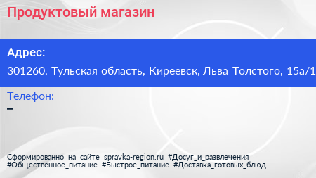 Продуктовый магазин по адресу 301260, Тульская область, Киреевск, Льва Толстого, 15а/1 в дальнейшем Организация, размещена в следующих категориях: