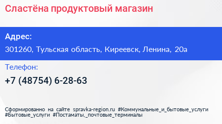 Сластёна, продуктовый магазин по адресу 301260, Тульская область, Киреевск, Ленина, 20а в дальнейшем Организация, размещена в следующих категориях: