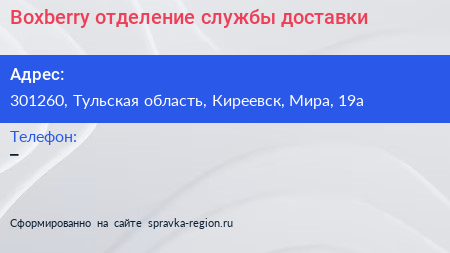 Boxberry, отделение службы доставки по адресу 301260, Тульская область, Киреевск, Мира, 19а в дальнейшем Организация, размещена в следующих категориях: