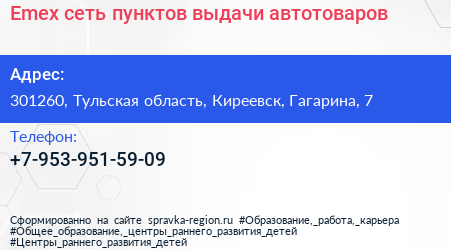 Emex, сеть пунктов выдачи автотоваров по адресу 301260, Тульская область, Киреевск, Гагарина, 7 в дальнейшем Организация, размещена в следующих категориях: